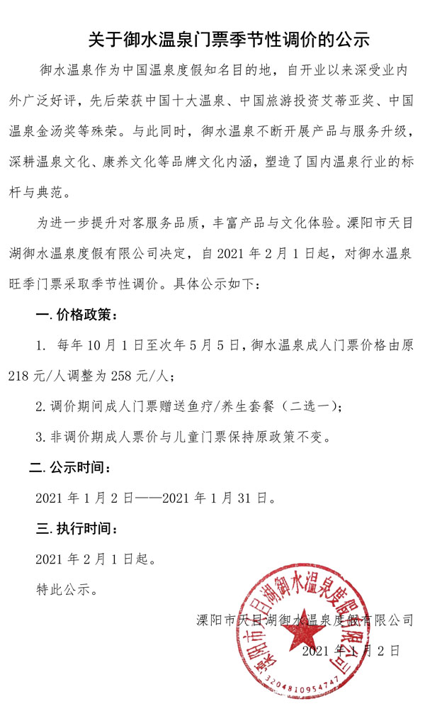 关于御水温泉门票季节性调价的公示